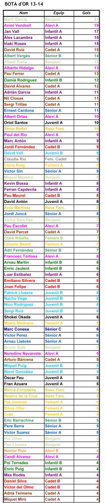Abans de rependre la competició aquest 2014, us mostrem com està la classificació de golejadors. Aquí la teniu: