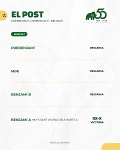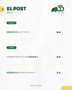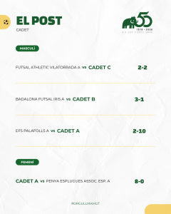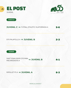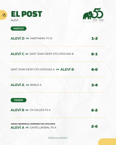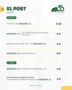 Destacar també els dos partits corresponents a l’anada de les semifinals del Campionat de Catalunya Aleví i Infantil femenins. Doble victòria de les mamuts que hauran de certificar aquest proper cap de setmana la classificació per la final. L’Aleví A va guanyar 2-0 al Castellbisbal F.S. i l’Infantil A va aconseguir un bon resultat en el seu desplaçament a Agramunt al vèncer per 1 a 5.