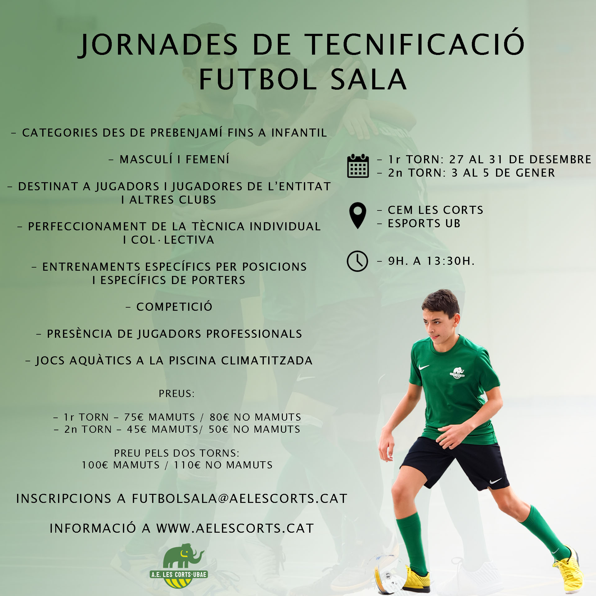 La tecnificació nadalenca de futbol sala se centrarà en el treball específic per posicions, millorant la tècnica individual i col·lectiva. A més els porters gaudiran també de sessions específiques. Tot això combinat amb petites jornades de competició, la presència de professionals, jocs a la piscina climatitzada del complex i algun obsequi sorpresa!