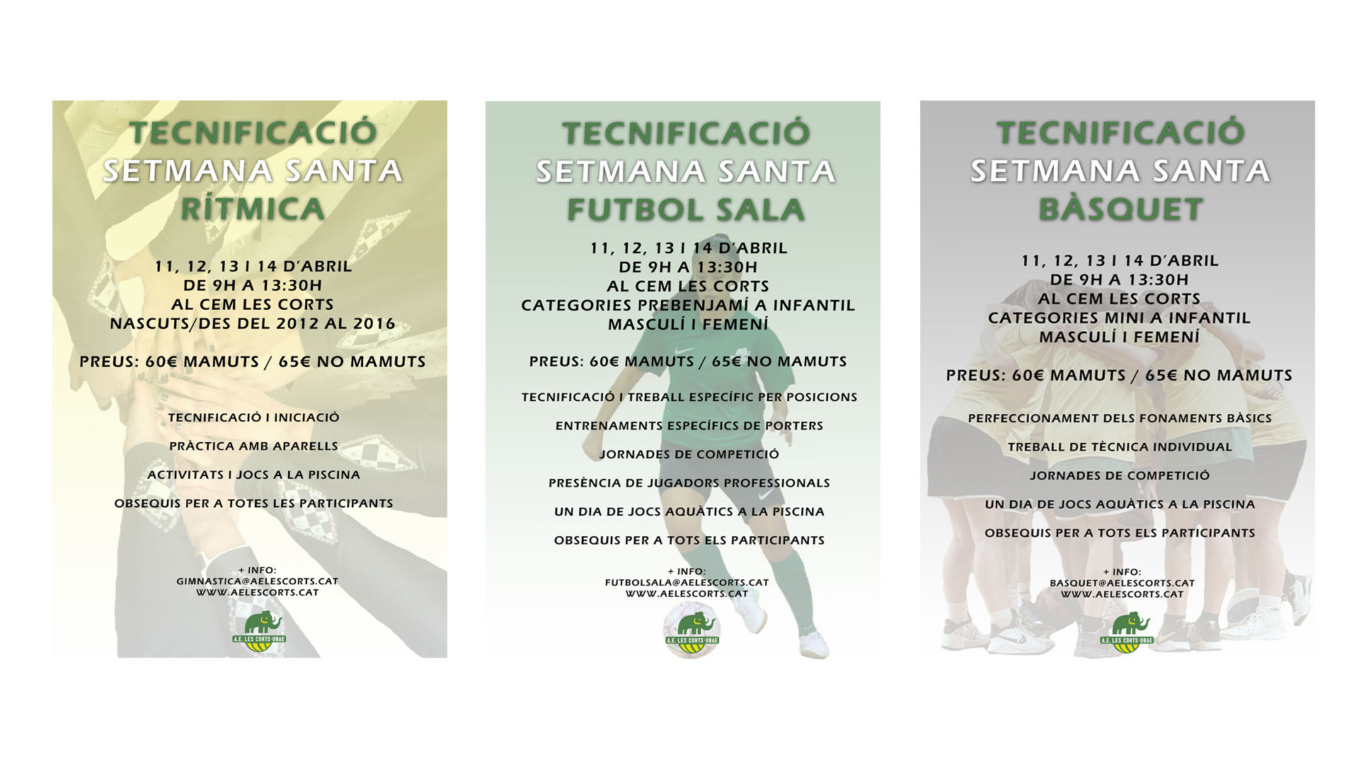 Aquestes vacances de Setmana Santa des de l’A.E. Les Corts UBAE us oferim unes tecnificacions per gaudir plegats de l’esport que més t’agrada. Podràs perfeccionar la tècnica i els fonaments bàsics dels futbol sala, el bàsquet o la gimnàstica rítmica.