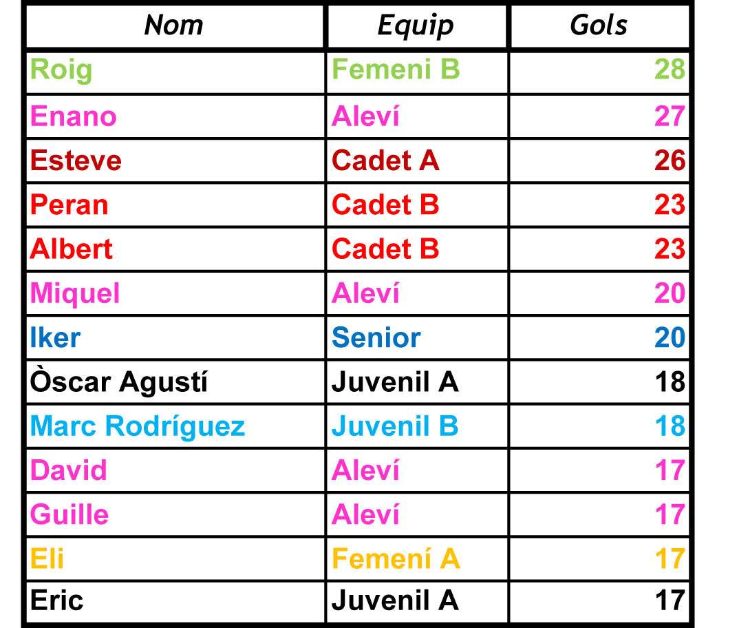 Per anar calentant motors de cara a la prèvia de demà, aquí teniu la classificació de golejadors actualitzada. Cal dir que no es comptabilitzen els partits de Copa Catalunya. La lluita a dalt de tot de la classificació segueix molt emocionant i cada jornada tenim alternaces en les 3 primeres posicions. Aquí teniu: