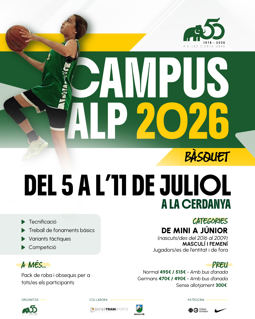 Informació dels Campus Alp 2026 ofertats per A.E. Les Corts amb pernoctació. Tres experiències espectaculars en un entorn immillorable per practicar l’esport que més t’agrada. Apunta-t’hi!