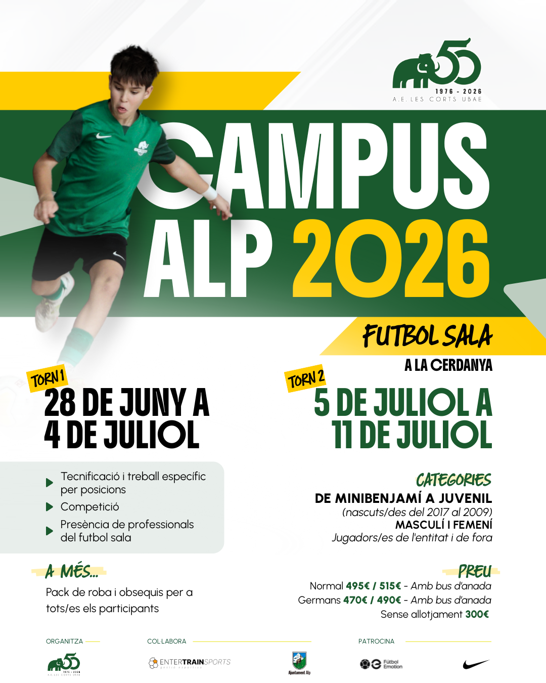 Ja estan obertes les inscripcions pel Campus de Futbol Sala Alp 2026, amb la idea de continuar oferint una proposta de tecnificació d’aquest esport i lleure en un entorn i instal·lacions privilegiats per a nens i nenes dels 9 als 17 anys.