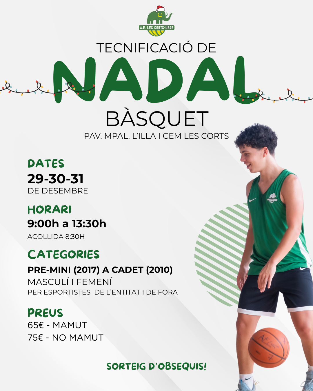 Per Nadal t’oferim un pla pel teu fill: bàsquet! A l’A.E. Les Corts UBAE organitzem la Tecnificació de Nadal de Bàsquet, per a nens i nenes de categoria Pre-Mini (2017) fins a Cadet (2010).