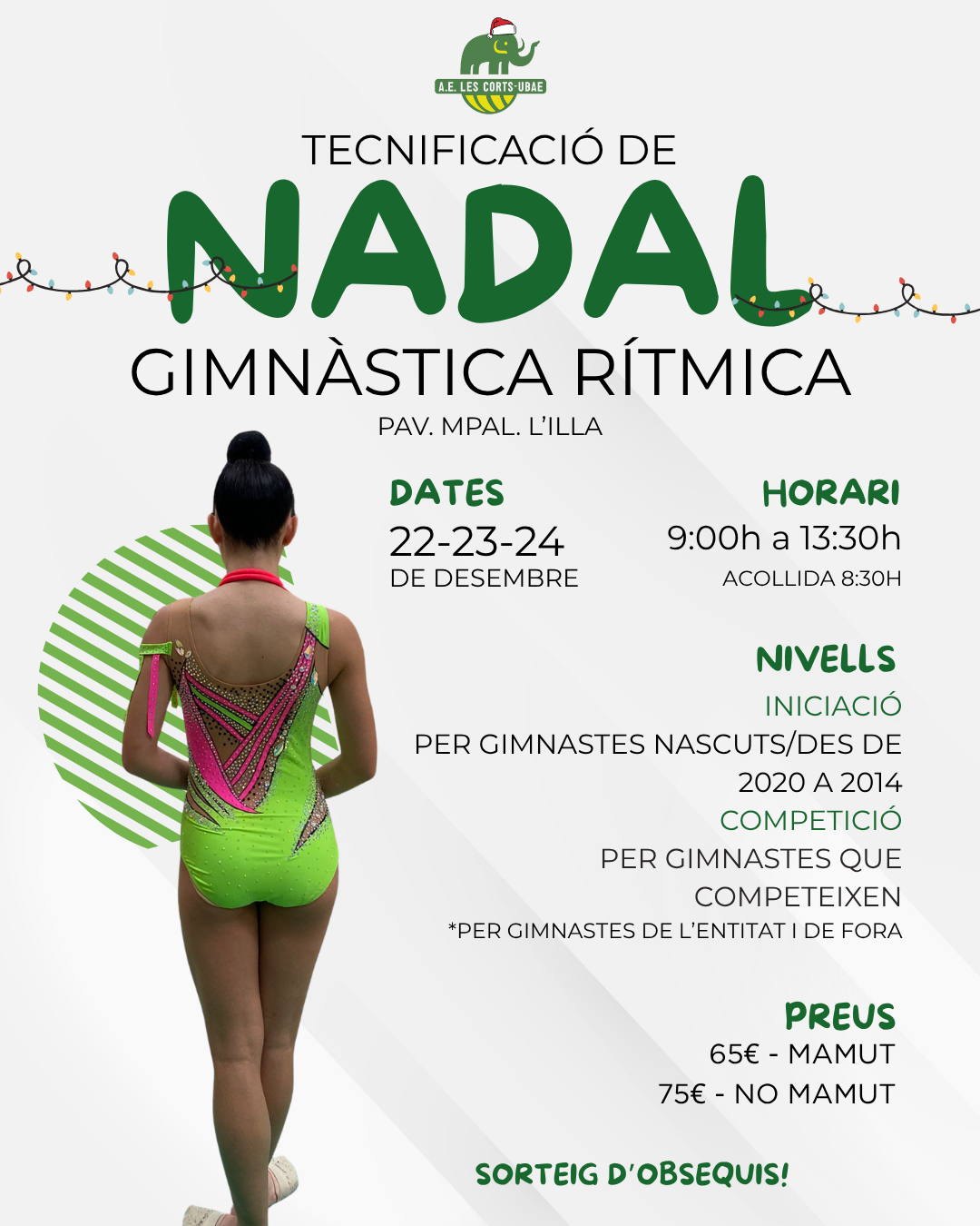 Està dedicat a nenes i nens d’iniciació i competició que treballaran en dues tecnificacions separades. Es farà en un únic torn els dies 22, 23 i 24 de desembre des de les 9:00 hores (acollida 8:30) fins a les 13:30 hores al Pavelló de l’Illa. El preu per un torn serà de 65€ per les gimnastes de l’entitat i 75€ per les de fora.