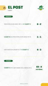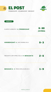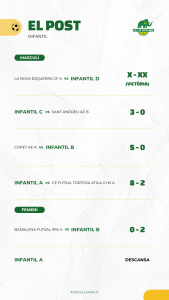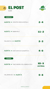 Bones victòries també dels mamuts més petits, el PreBenjamí i el MiniBenjamí. En categories Aleví i Infantil masculines vam tenir 3 victòries en 4 partits en tots dos casos. Aleví C, Aleví B i Aleví A van sumar els 3 punts igual que l’Infantil D, Infantil C i Infantil A masculins.