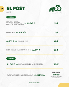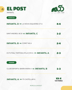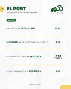Per la seva banda el PreBenjamí també es va alçar amb el títol en aquesta segona fase. Destacar també el ple de victòries dels 4 alevins masculins a qui s’hi va sumar també l’Aleví B femení. Infantil A, Cadet A i Sènior C femenins també van sumar els 3 punts.