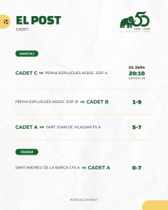 Menció especial pels dos masculins de categoria nacional que van sumar dues victòries en dues pistes molt complicades signant així un gran cap de setmana. El Sènior A femení en canvi va caure a la seva visita a Móstoles.