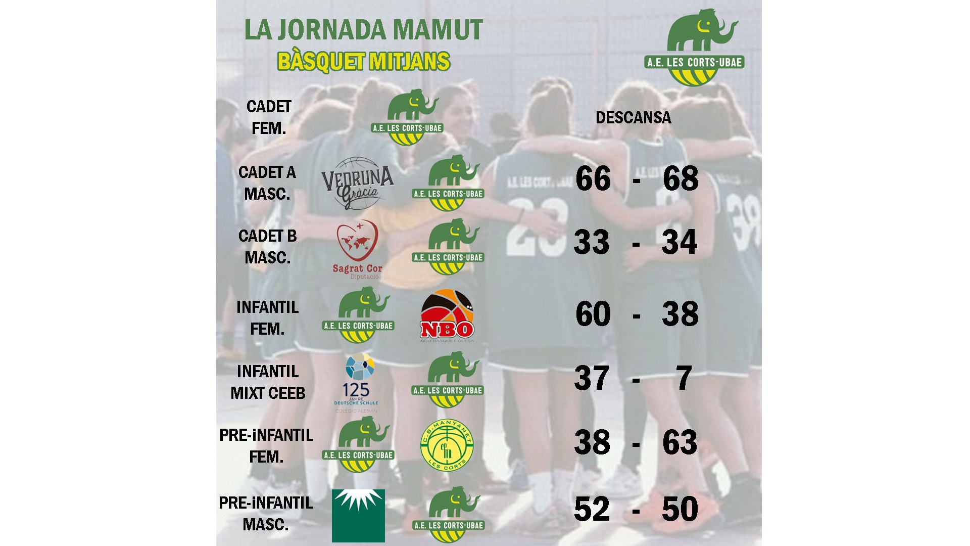 Mini Masculí 73-54 BAM: Tercer enfrontament de la temporada contra BAM. Conscients de que seria un partit molt competit, els locals van sortir molt concentrats. A mesura que avançaven els minuts, el marcador es mantenia molt igualat. Va ser en el darrer quart, gràcies a un gran parcial, on els mamuts van fer-se amb la victòria.