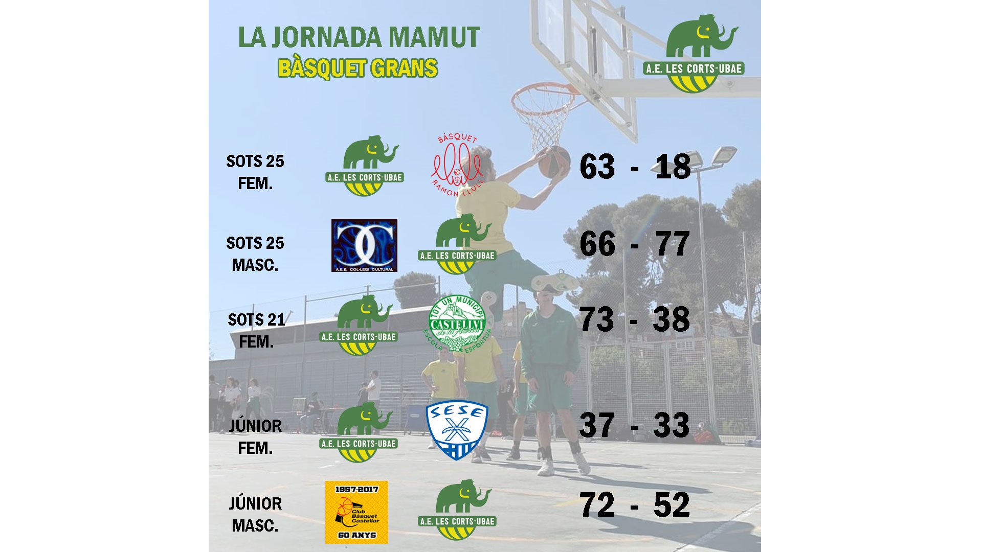Júnior femení 37-33 SESE A: Primer partit oficial contra un rival de gran tradició en el bàsquet català. Gran inici de les locals que els hi va permetre obtenir un avantatge de 9 punts en el marcador. A partir de llavors, les rivals van trobar el camí a cistella per apropar-se molt en el marcador. Joc molt igualat fins els darrers minuts en els quals les mamuts van estar més encertades per fer-se amb la primera victòria de la temporada.