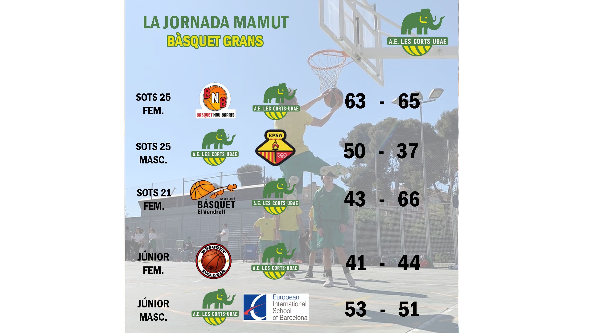 AB Vendrell 43-66 Sots-21 Femení: Visita a una de les pistes complicades de la categoria i gràcies a un gran treball col·lectiu, es va obtenir una victòria solvent. Primer quart molt igualat amb cistelles de qualitat. A destacar l’encert exterior de les del Vendrell. A partir del segon període es van ajustar certs detalls defensius i això va permetre a les mamuts distanciar-se en el marcador i jugar amb més confiança en atac.