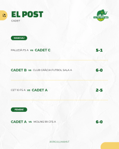Bons triomfs dels Divisió d’Honor Aleví A i Cadet A masculins. Empats treballats també per Infantil A, Juvenil B i Juvenil C masculins; i ple de victòries pels equips femenins, Cadet A, Juvenils B i A i Sèniors C i B.