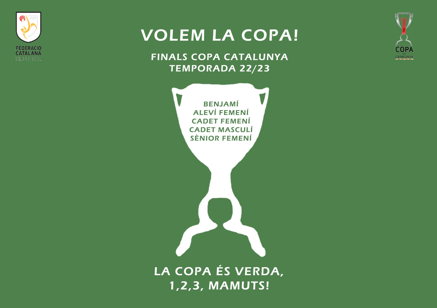Aquest cap de setmana es disputen les finals de la Copa Catalunya de futbol sala base i els mamuts hi serem amb 4 equips. A més cal sumar-hi la final Sènior femenina que es disputarà el proper agost.