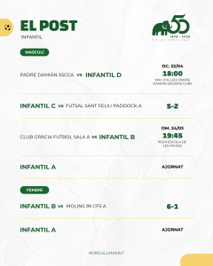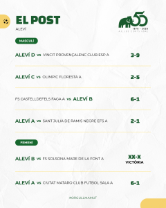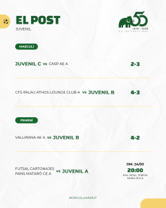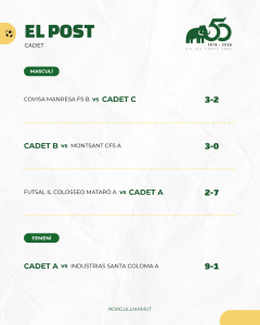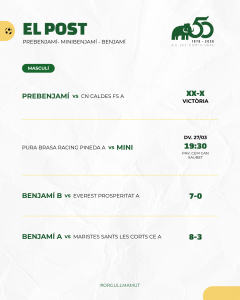 Bon paper també dels més petits, PreBenjamí i els dos Benjamins A i B amb un triplet de victòries. Aleví A i Cadet A masculins també van sumar el +3 i continuen a la part alta de la taula. Mateixa dinàmica que segueix el Cadet A femení amb la seva victòria.