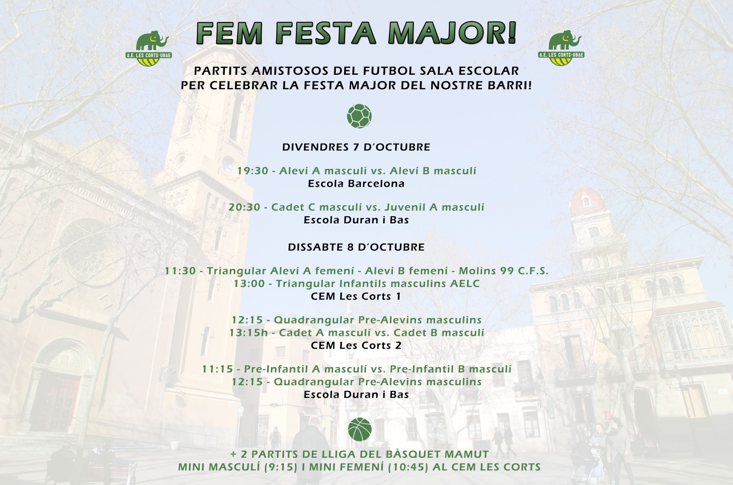 El passat 30 de setembre començava la Festa Major de Les Corts la qual durarà fins el proper 12 d’octubre. En motiu d’aquesta celebració al nostre barri hem volgut disputar un seguit de partits amistosos del futbol sala escolar que ja es van iniciar el passat cap de setmana i continuaran el proper.