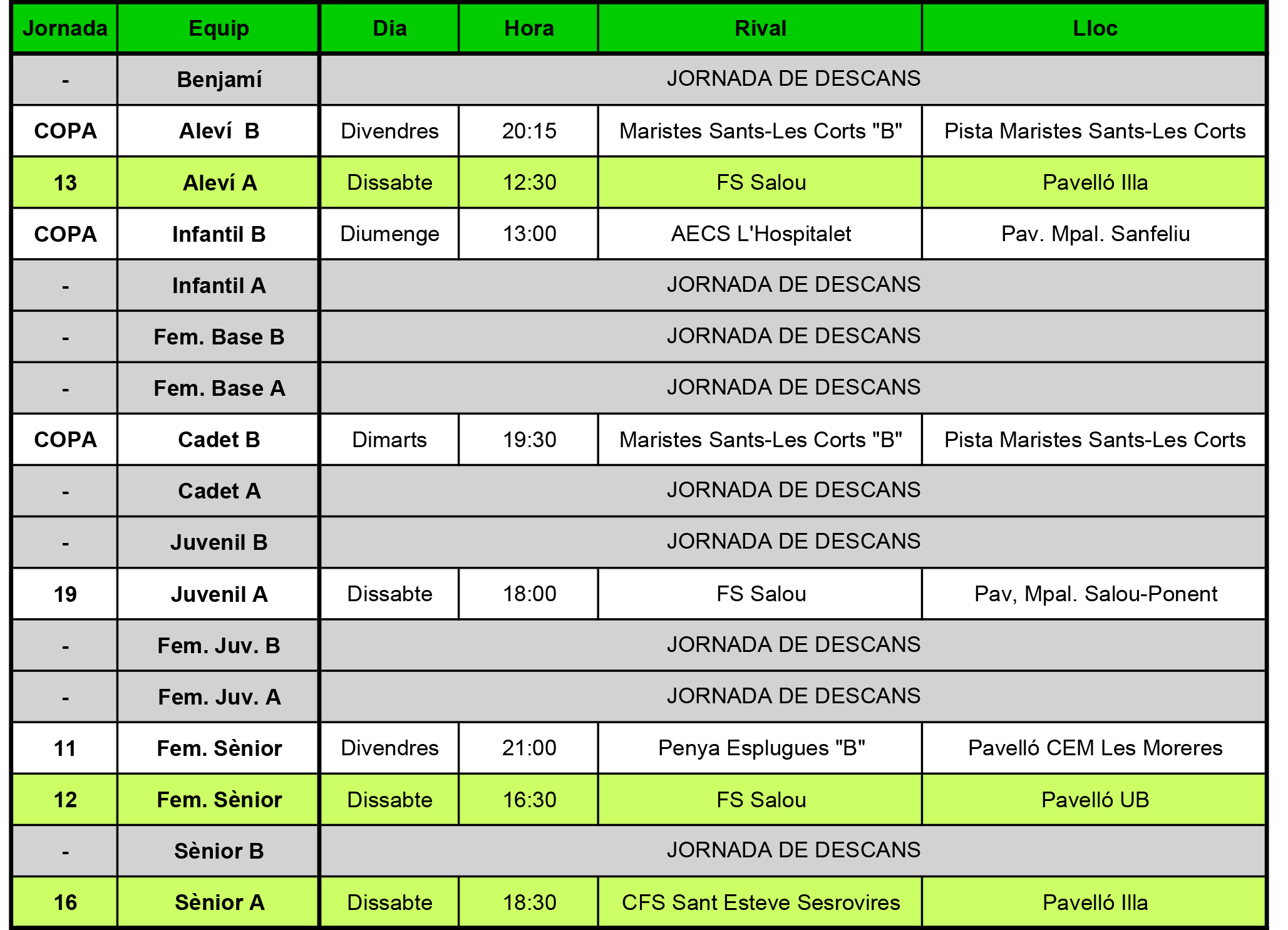 Jornada de descans pels equips que competeixen a a FCF. Només juguen jornada Juvenil Nacional i Sènior A que competeixen a RFEF. Però també hi ha partits aplaçats i partits de Copa Catalunya aprofitant el forat. Aquí els teniu tots: