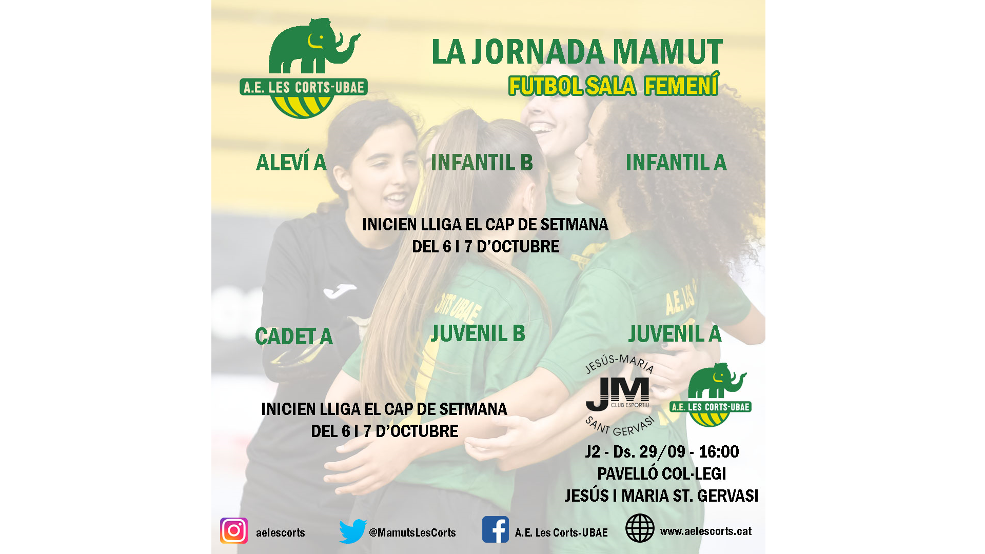Us deixem la prèvia de la jornada amb els 6 partits de lliga dels equips que ja han iniciat competició oficial. Destaquem el partit del Juvenil A femení davant el C.E. Jesús i Maria Sant Gervasi. Tots dos equips van guanyar a la primera jornada i un partit entre dos clàssics del futsal a la ciutat sempre promet. Veniu a animar els mamuts, us esperem!