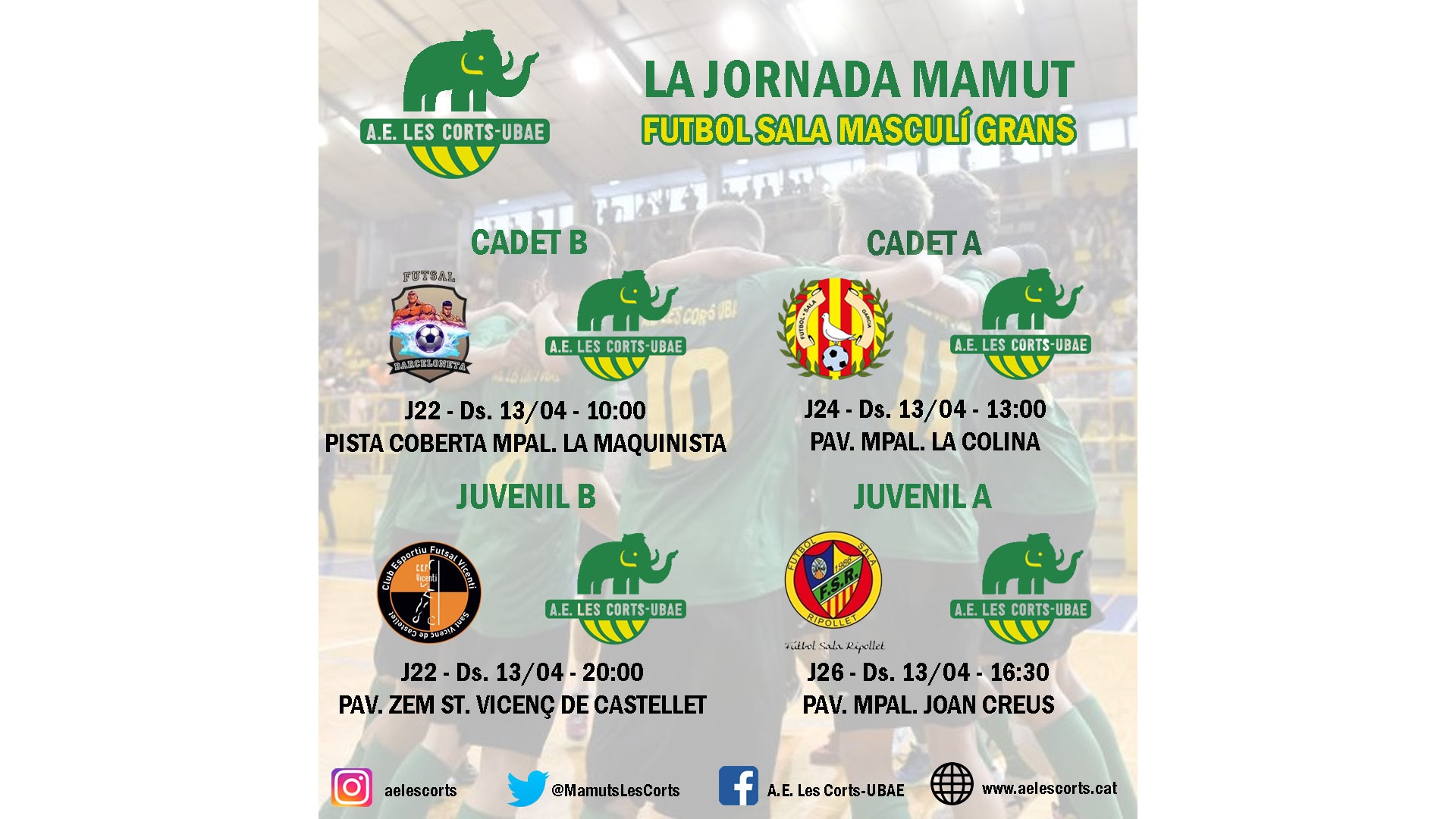 Ja tenim aquí una nova prèvia de la jornada mamut amb partits de gran interès. El Cadet A masculí visita l’Industrias Santa Coloma buscant encarrilar el segon lloc. Per la seva banda l’Infantil A masculí rep, abans de marxar a Tenerife, el Manresa Club de Futbol Sala, tercer classificat, una victòria dels nostres permetria passar-los a la classificació i apropar-se a l’objectiu d’acabar entre els quatre primers a la taula. L’Infantil C masculí jugarà un partit vital per mantenir-se en el segon lloc i perseguir l’ascens, serà davant el 4t classificat, SAFA Horta. Destaquem també la visita del Futsal Mataró per jugar amb el nostre Sènior A Femení, les del Maresme són les líders. Finalment ens fixem en els desplaçaments dels dos Juvenils masculins i del Sènior A masculí tots en pistes molt complicades com són les del Futsal Vicentí, el FS Ripollet i el CE Sant Julià respectivament.