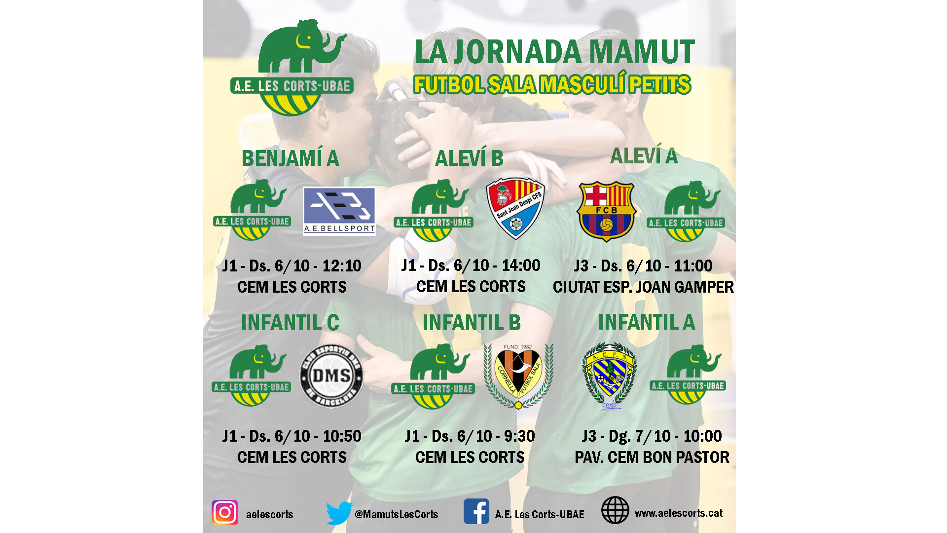 Aquí teniu la prèvia de la jornada mamut! La primera totalment completa ja que aquest cap de setmana inicien lliga els equips que encara no ho havien fet. Per aquesta jornada destaquem el partidàs que disputarà l’Aleví A davant el Barça Lassa. Veniu a animar els mamuts!!!