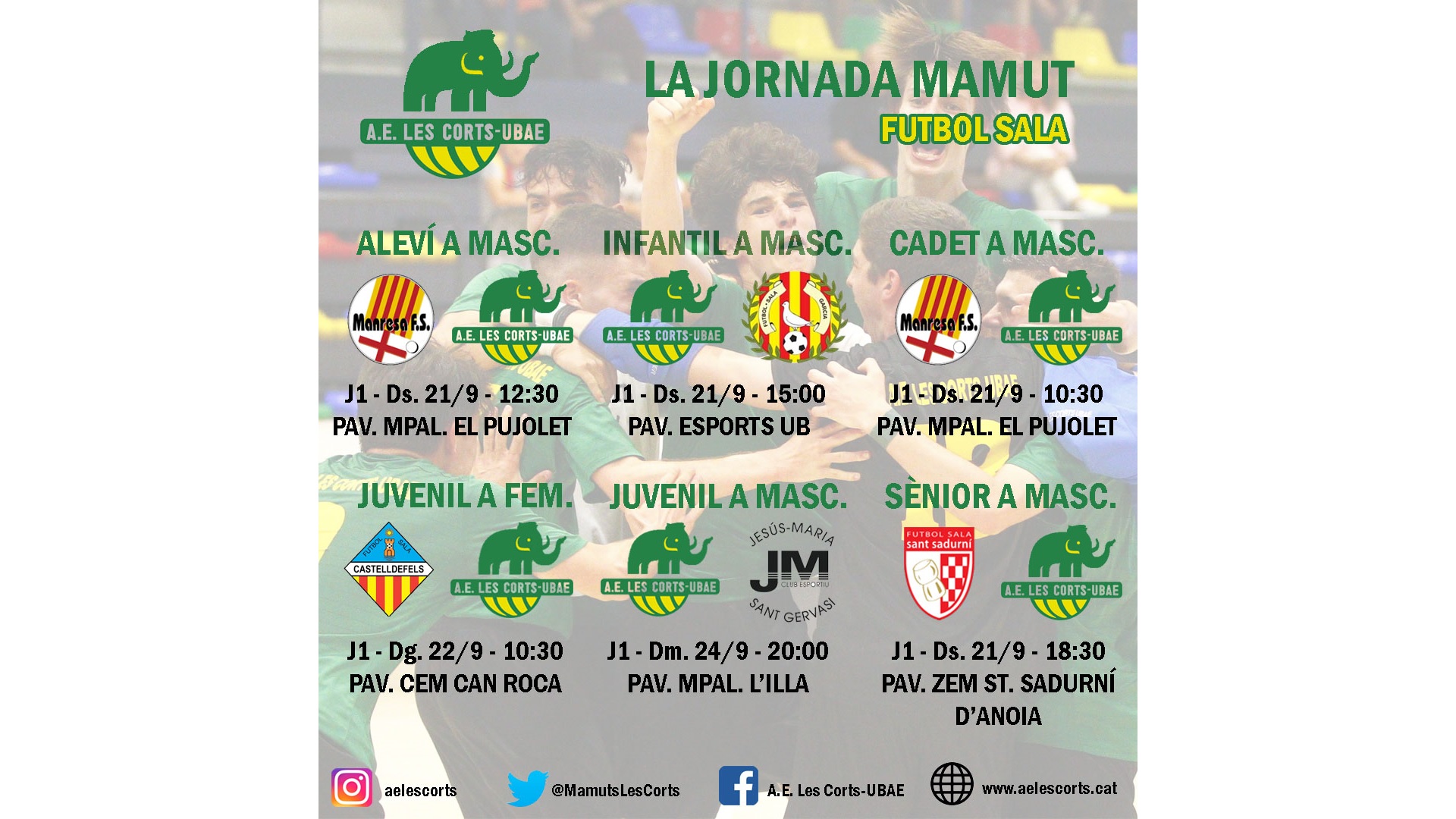 Rivals de molta entitat pel debut de tots els equips, amb un doble desplaçament a Manresa d’Aleví A i Cadet A masculins i visita a pista del FS Castelldefels del Juvenil A femení. El Sènior A masculí per la seva banda viatja a la sempre complicada pista del FS Sant Sadurní. Infantil A i Juvenil A masculins comencen com a locals, amb tot un partidàs dels primers davant Industrias Santa Coloma i un debut especial dels segons ja que serà dimarts tot just després de la presentació dels equips federats de futbol sala.
