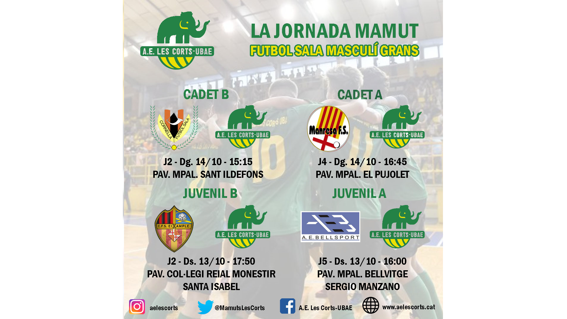 El pont no ens atura! A continuació us deixem la prèvia de la jornada. Molts partits interessants amb desplaçaments força complicats. Destaquem el partit del Cadet A davant el Manresa F.S.. No dubteu en venir a animar els mamuts!