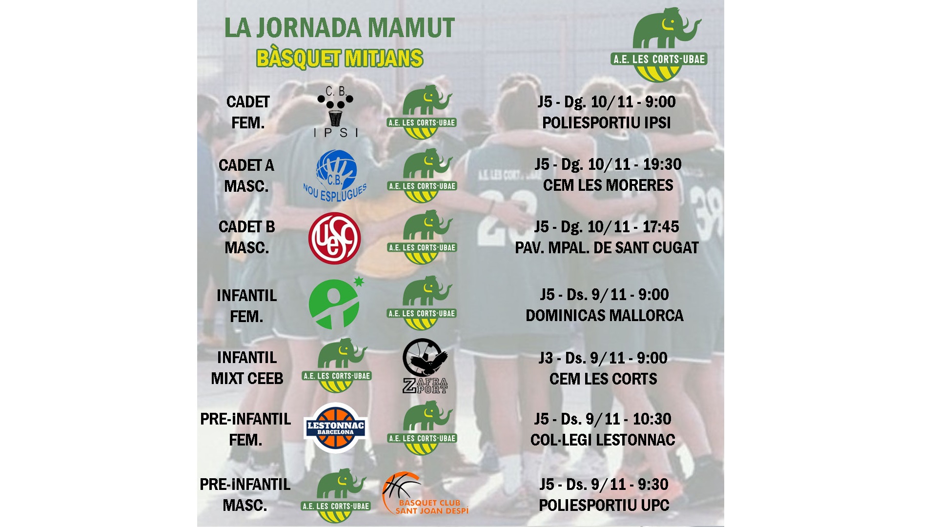 Nova prèvia de la jornada mamut de bàsquet. Després del passat cap de setmana amb només tres partits tornem a la normalitat amb pràcticament tots els conjunts competint. Aquí teniu tots els partits amb els rivals i horaris. Us esperem a les pistes per animar els mamuts. Som-hi!!!