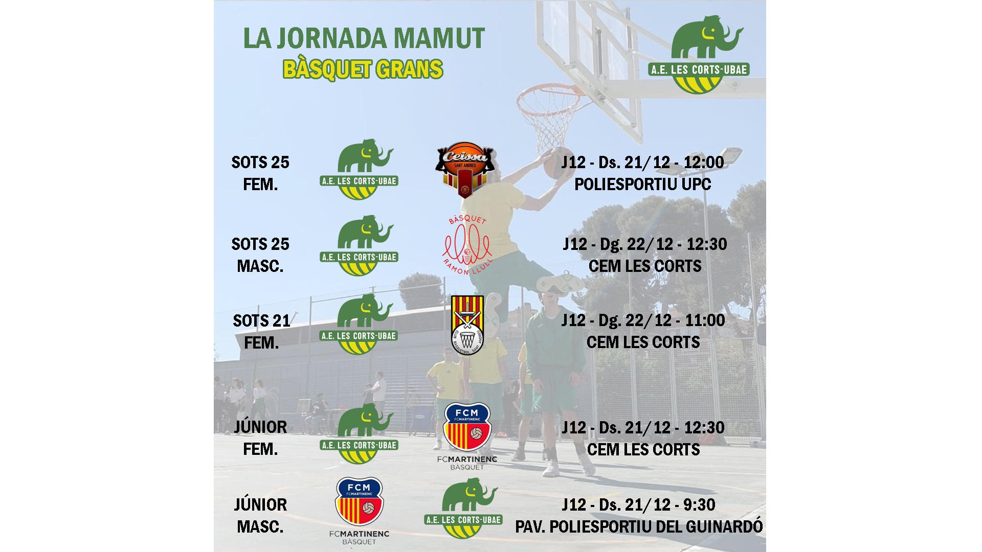 Una nova prèvia de la jornada mamut de bàsquet. Els equips escolars (CEEB) ja han finalitzat la primera fase. Els equips federats (FCBQ) fins a categoria cadet disputen la darrera jornada de la seves lligues en aquest primer tram de temporada. Us deixem tots els partits amb els rivals, horaris i pistes perquè animeu els mamuts en aquest últim cap de setmana de competició abans de l’aturada de Nadal. Un total de 12 partits i 10 com a locals, no teniu excusa. Som-hi!!!