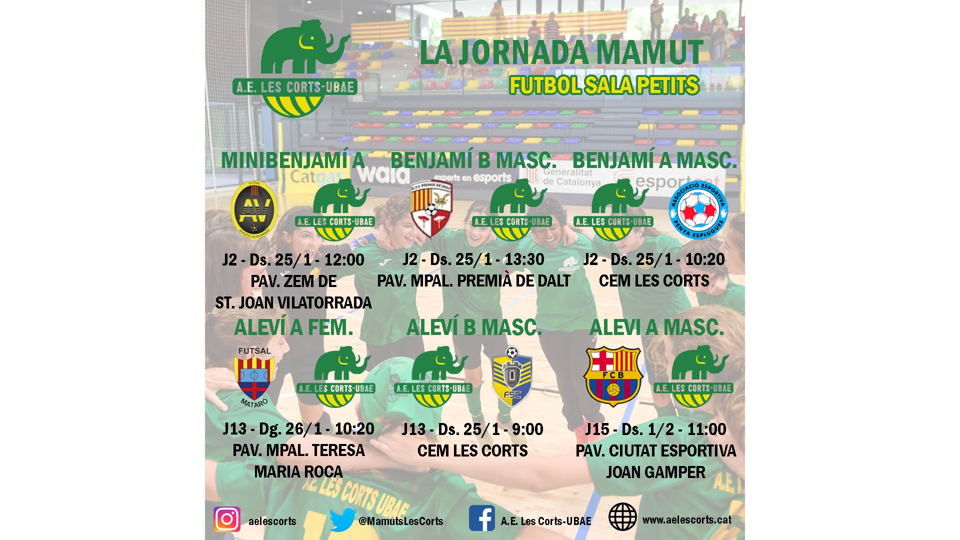 Arriba un nou cap de setmana i amb aquest una nova prèvia de la jornada mamut de futbol sala. Us portem tots els partits amb els horaris i les pistes perquè pugueu animar els mamuts. Aquesta jornada destaquem un gran partit per sobre de tots, el de l’Aleví A femení davant el Futsal Mataró. Últim matx de la primera volta que enfronta a dos equips que comparteixen liderat amb ple de victòries. L’altre partit destacat en majúscules, però que es disputarà el dissabte 1 de febrer, és el de l’Aleví A masculí davant el Barça.