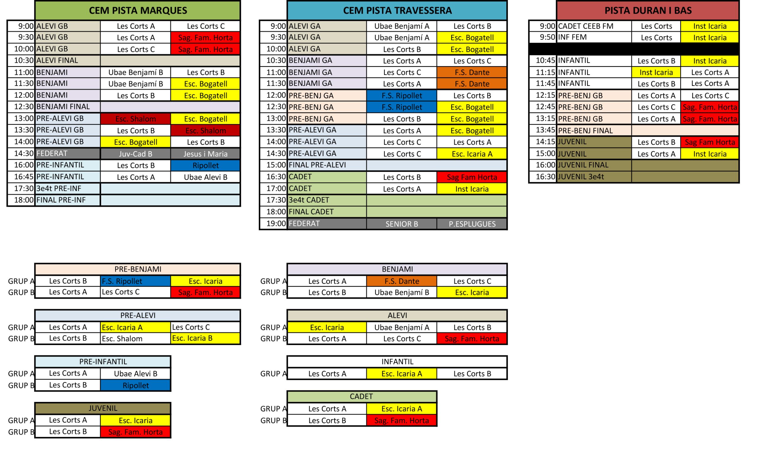 Aquí teniu els horaris de tots els partits. A més a més, diumenge, en motiu de la Festa Major del barri, de 11 a 14 hi haurà diferents activitats al Complex. A les 11,30h master class de zumba familiar, a les 13h concert i aperitiu, i durant tot el matí inflables.