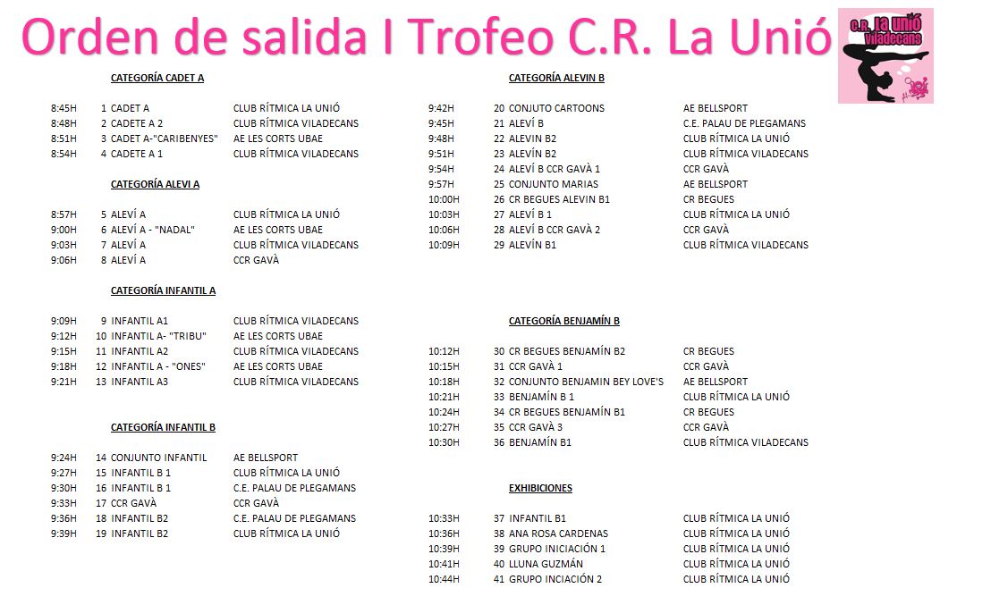 No podrem plegar massa tard ja que demà ens desplaçarem a Viladecans per participar en el I Trofeu C.R. La Unió. Estem molt il·lusionats de que ens hagin convidat en la seva primera edició! Hi participarem amb tres conjunts: