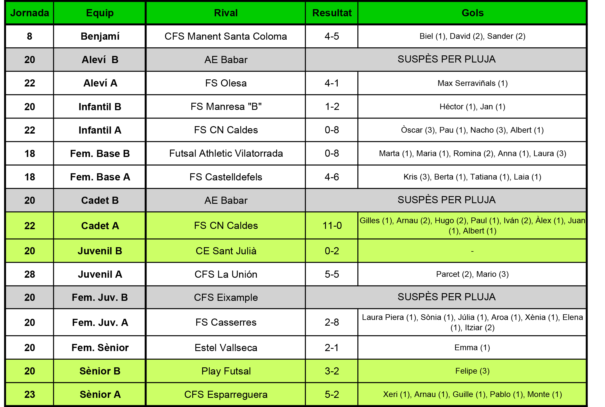 Sènior B: “Partit igualat en tot moment. Ens avancem 1-0. Ens empaten. Fem el 2-1. A manca de poc més d’un minut ens empaten amb joc de 5 (llàstima perquè ho estàvem defensant prou bé). Passats uns 20 segons fem el 3-2 en una paral·lela llarga rematada amb un xut potentissim” (Mario)