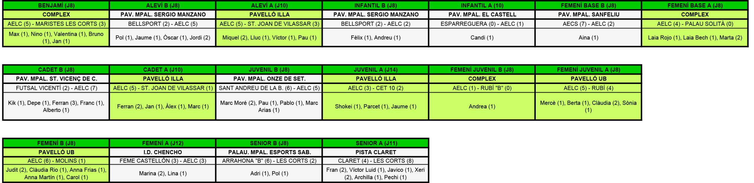 Resultats de cap de setmana, amb un balanç de 12 victòries, 2 empats i 3 derrotes.