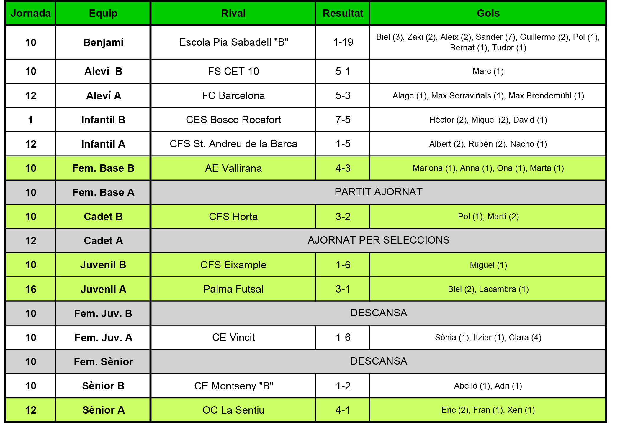 Sènior A: “Seriosa primera part on dos gols d’estratègia i un altre de jugada col·lectiva ens permeten anar al descans amb un 3 a 0 i sense donar cap opció al rival. La segona part la comencem bé. En una delicatessen de Gerard López ens posem 4-0 al marcador. A partir d’aquest moment ens contagiem del rival i ens diluïm i li donem més concessions, ens crea ocasions i ens fa el 4-1. Finalitzem el partit amb sensacions negatives però amb ganes de capgirarles de cara a la propera jornada on ens visita el líder” (Guillem Artés)