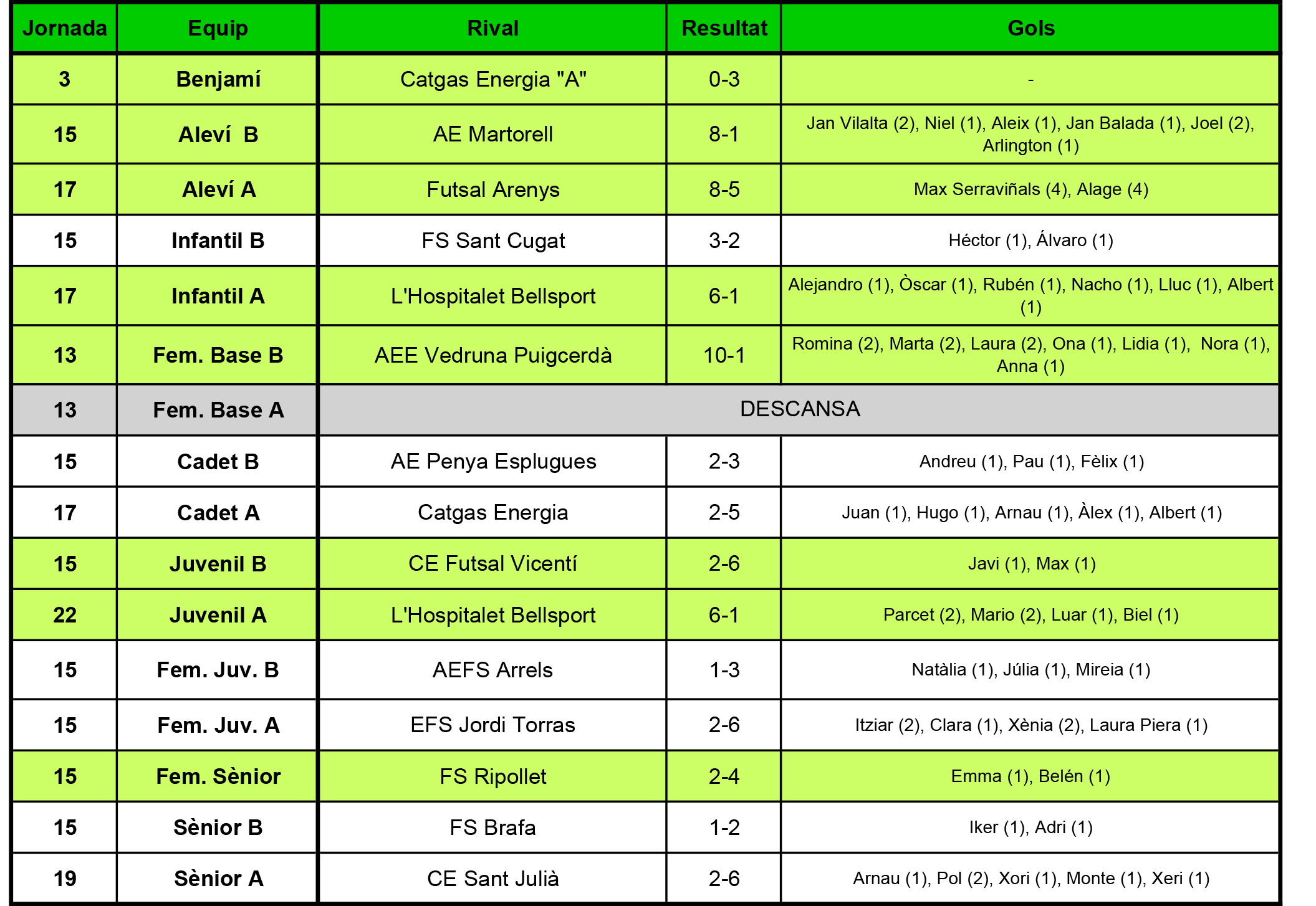 Juvenil B: “Mal partit. Ens avancem però poc a poc ens guanyen terreny i ens giren el marcador fins el 1 a 3. Ens superen en intensitat i regalem els gols. Demanem temps i canviem la dinàmica però arribem igual al descans. A la segona part seguim a prop de la seva àrea buscant el gol que ens posi al partit però tampoc generem molt perill, en canvi ells només penjant pilotes sí. En una jugada desafortunada expulsen a Jan (porter) i encaixem el 4rt en inferioritat, gol que ha acabat d’enfonsar-nos. Poc després encaixem el 5è i jugant de 5 cau un gol més per cada banda. Seguim” (Nil)