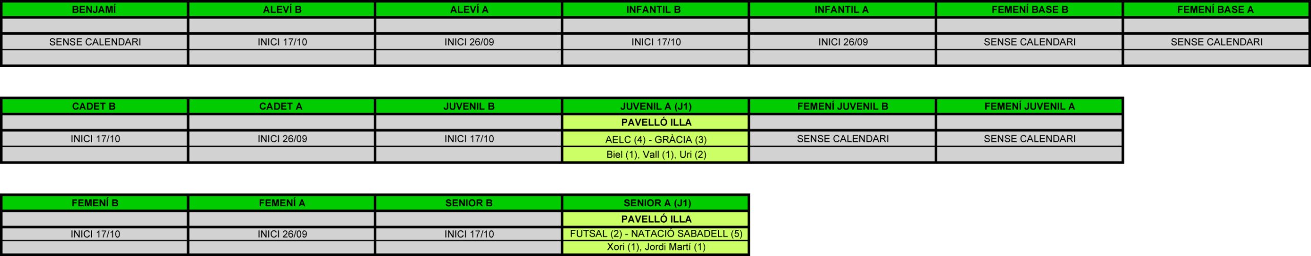 Sènior “A”: “Resultat massa abultat pel vist al Pavelló de la Illa. A la primera part som superiors a un dels candidats a l’ascens però no concretem les nombroses ocasions que tenim. En canvi ells sí que ho fan fins el 1-2 del descans. A la segona part baixem físicament. El partit està igualat però en dues pèrdues encaixem dos gols a la contra. Jugant de 5 marquem el 2-4 i al final amb un jugador menys nosaltres encaixem el 5è. Arribem justos de preparació i en aquesta categoria els errors es paguen. És l’inici i seguirem competint cada setmana. Proper partit dissabte a la tarda derbi contra Sang Culè” (Marc Solé)