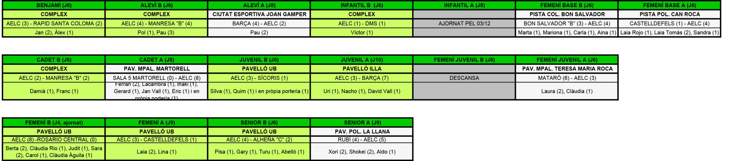 Resultats de cap de setmana, amb un balanç de 9 victòries, 3 empats i 3 derrotes.