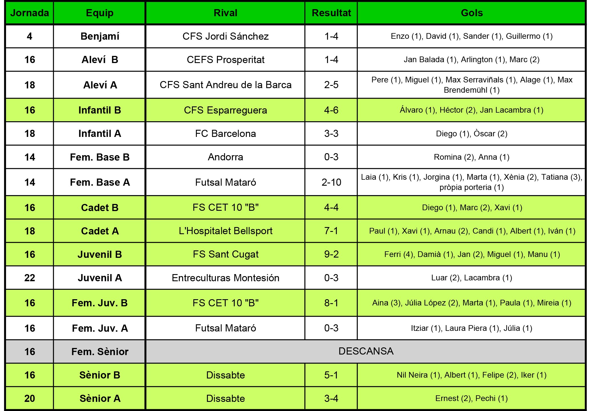 Benjamí: “Partit competit i igualat que aquest cop sí que hem tret endavant. Avui hem estat més intensos que mai en defensa i ho hem lluitat tot. Ja tocava que el resultat també ens acompanyés. Hem tingut encert en la finalització (un golàs des de mig camp entre els gols) i ells han fallat més, en gran part, gràcies al nostre porteràs” (Adri)