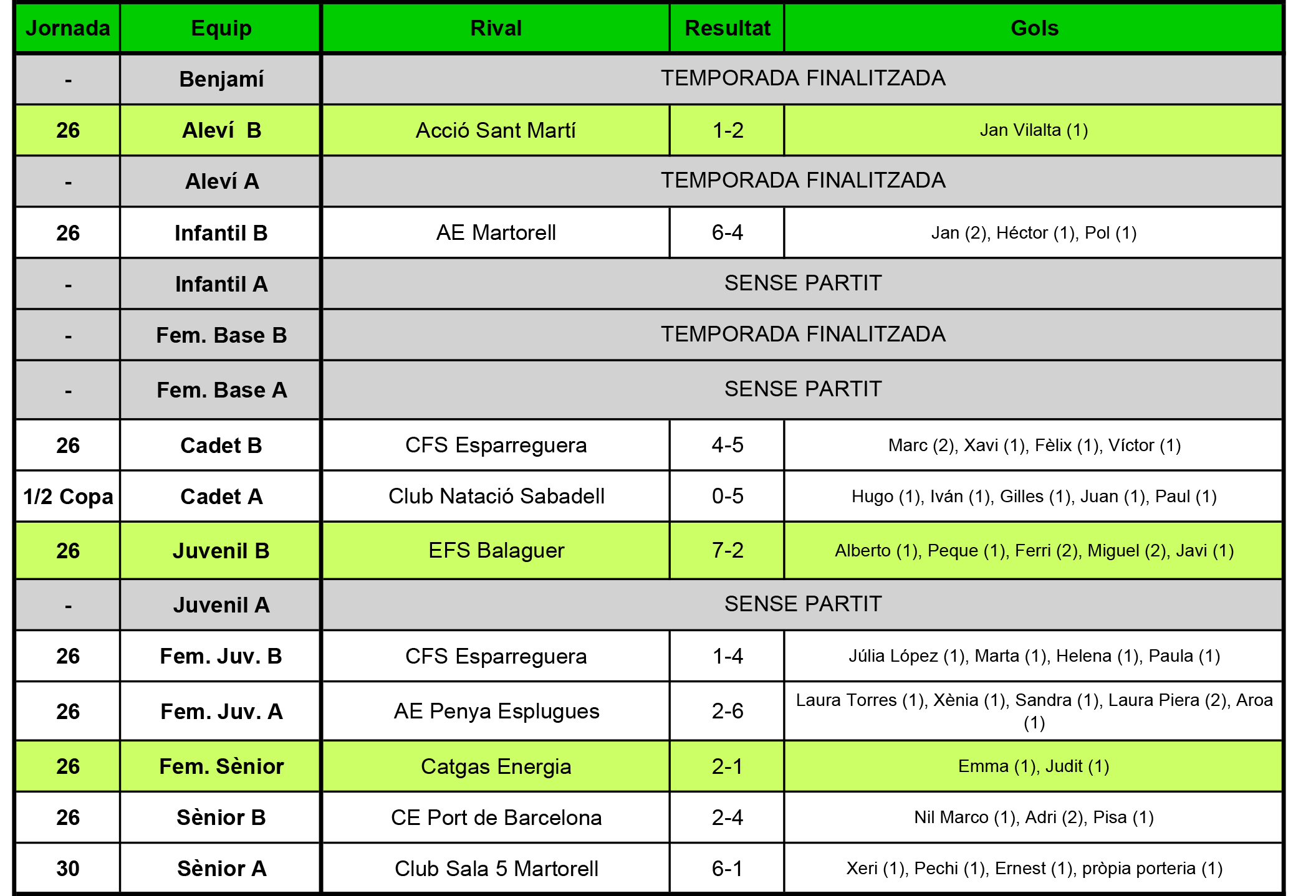 Femení Cadet Juvenil B: “Diumenge d’infart i èpic. Pel matí les líders perden el seu partit deixant a la nostra mà la possibilitat de ser campiones davant les terceres. Hem sortit a tope, molt ficades al partit, superant els nervis i al minut 7 ja guanyàvem 0-3. Un gol seu a mitjans de la part i una pressió més intensa ens ha fet patir durant 10 minuts però hem aguantat el 1-3. La segona part ha estat perfecte en tots els aspectes. Amb un gran joc i ocasions de tots els colors (4 pals inclosos) hem pogut fet molt de mal però només ha entrat una. Molt contents sobre tot per les noies que han cregut durant tota la temporada!! S’ho mereixen!! A destacar una segona volta quasi perfecte on només hem cedit un empat” (Borja)